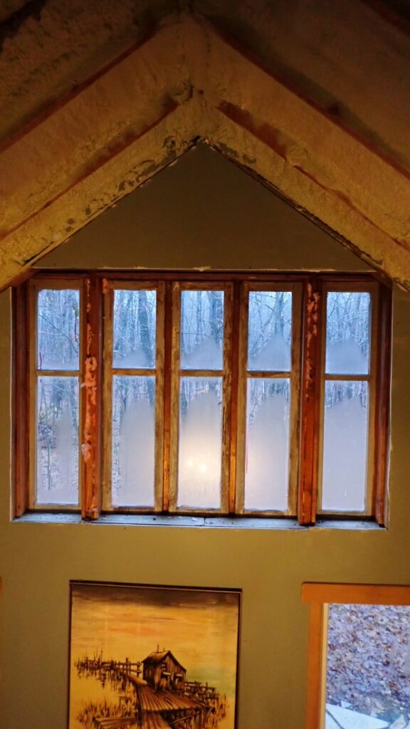 The house frame is made from 2’x6’ hemlock actual size. This presented a few minor issues in construction due to the nominal dimensions of retail lumber. The ceiling rafter, same. 10 ½ – 12 roof pitch. With a 1’ horizontal strapping covered with metal roof. The roof surface area is 660 sq ft and needed a base restoration that consisted of a wire brush by hand and base coat of grey primer and a coat of Hunter Green. The paint and primer is Sher-Cyl by Sherwin Williams. Removal of the chimney and apply a patch.